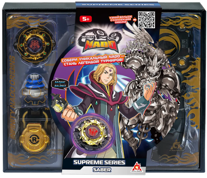 Металлический волчок Infinity Nado Суприм Saber Воздушная сабля принадлежит Аресу Мира и состоит из пяти частей: аватара Nado, верхнего кольца, тройного атакующего кольца, оси и наконечника.